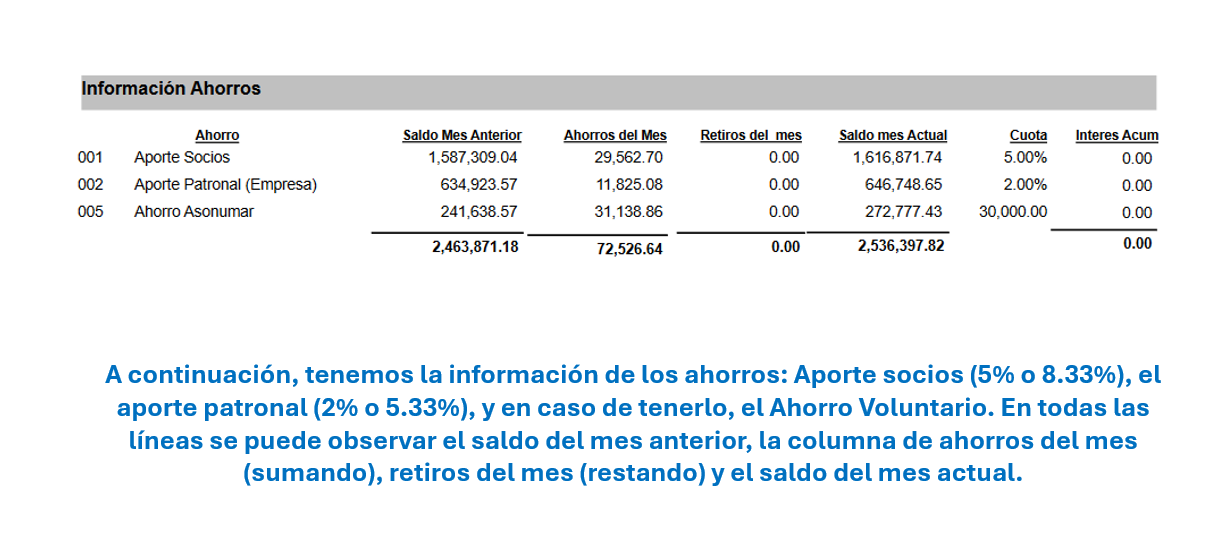 El estado de cuenta no es la mejor forma para constatar o proyectar las deducciones que se aplican al salario, esto por cuanto podría haber variaciones entre la fecha de emisión y la aplicación de los rebajos del mes anterior o del mes siguiente. Para tener el dato exacto, lo ideal es ingresar a la sección "Deducciones" del SAG ASONUMAR (Web y app GESTIONE+), en ella se puede encontrar el detalle de las deducciones aplicadas en periodos anteriores (semanales o mensuales), así como lo que se va rebajar en el siguiente periodo (semanales los lunes en la tarde, mensuales después del 15 de cada mes).